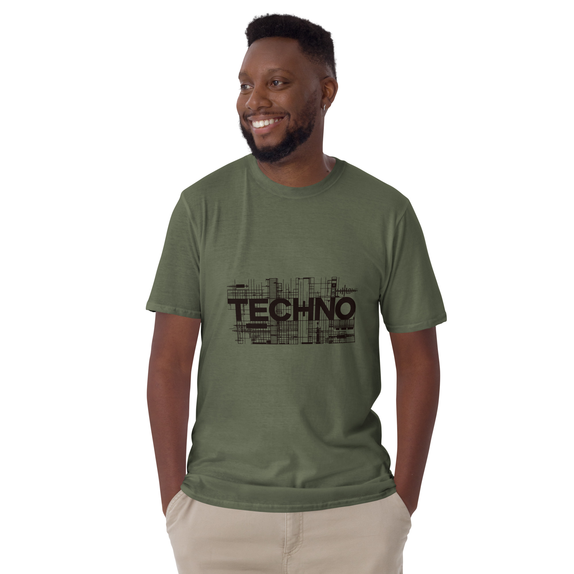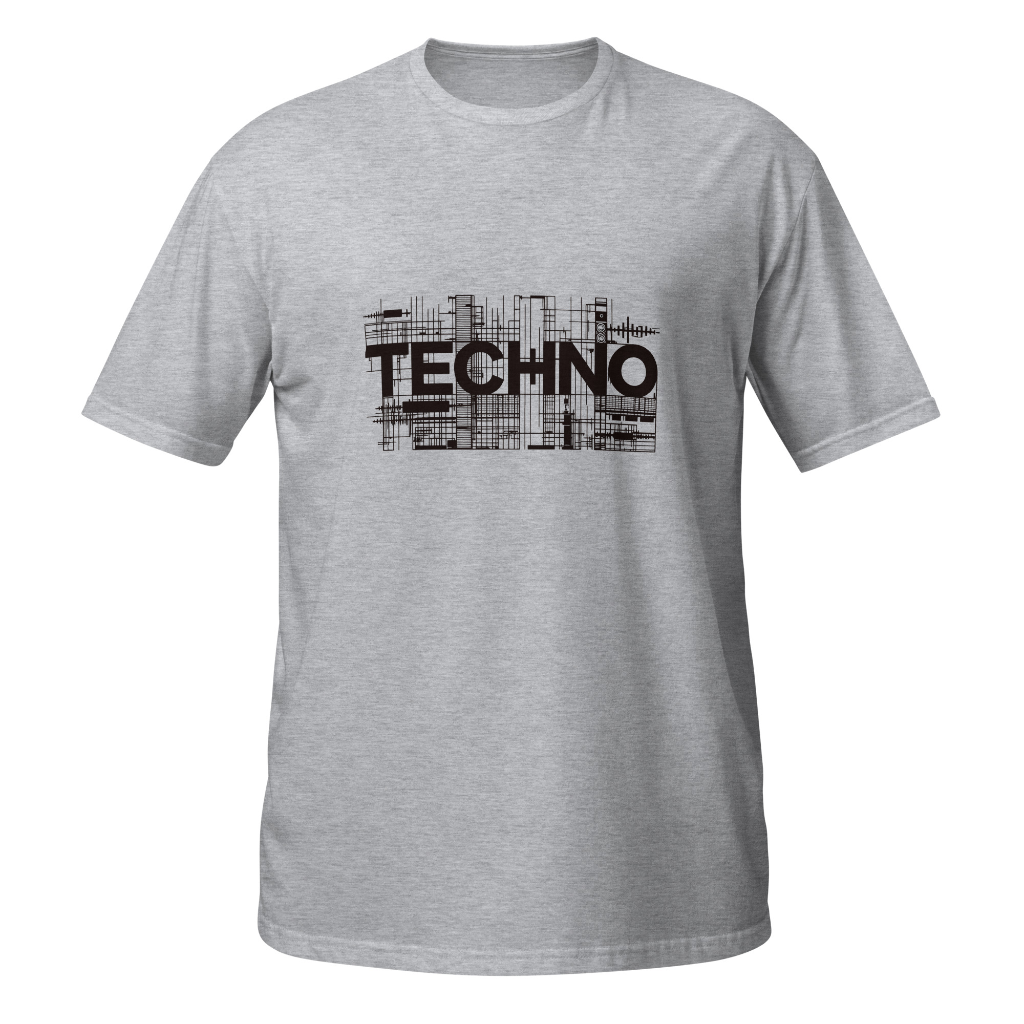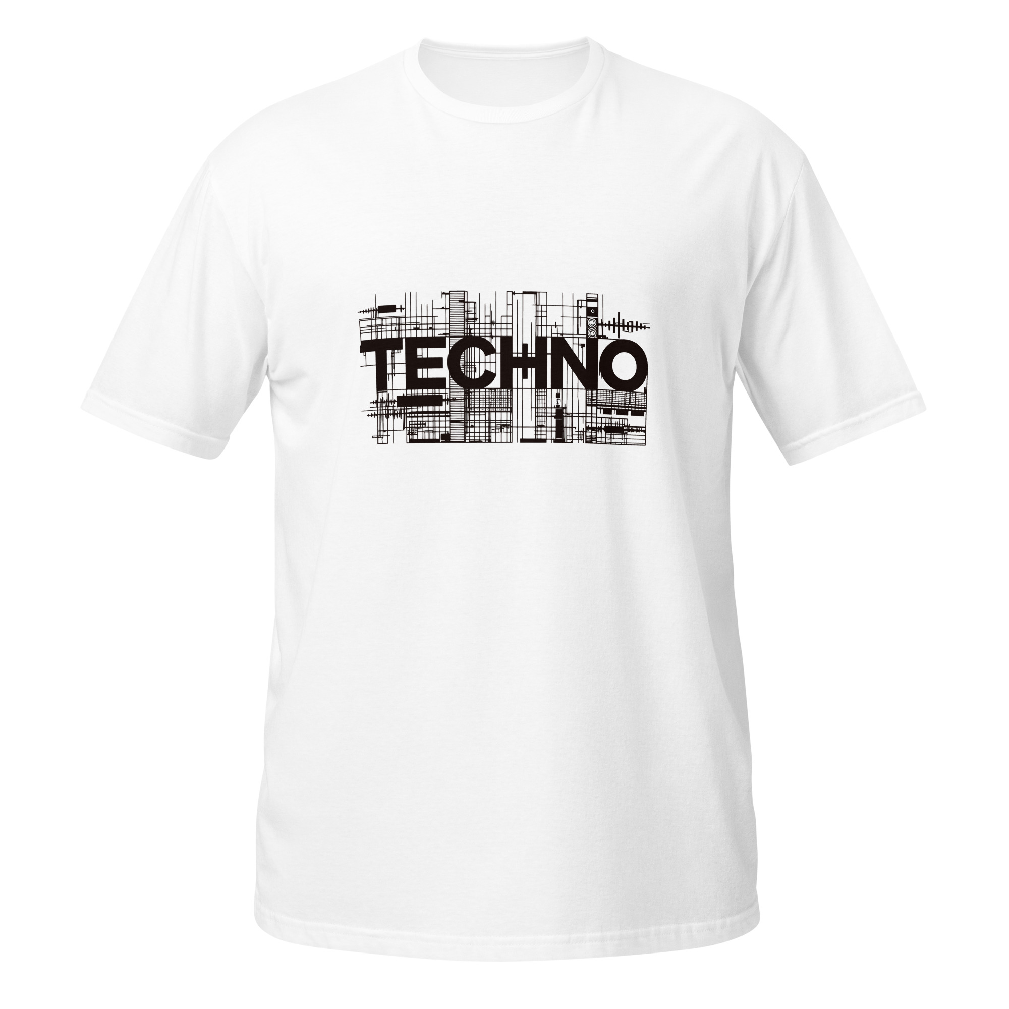 Ce design typographique met en avant le mot techno avec une composition graphique structurée, composée de lignes et de formes rappelant les circuits et les constructions sonores.